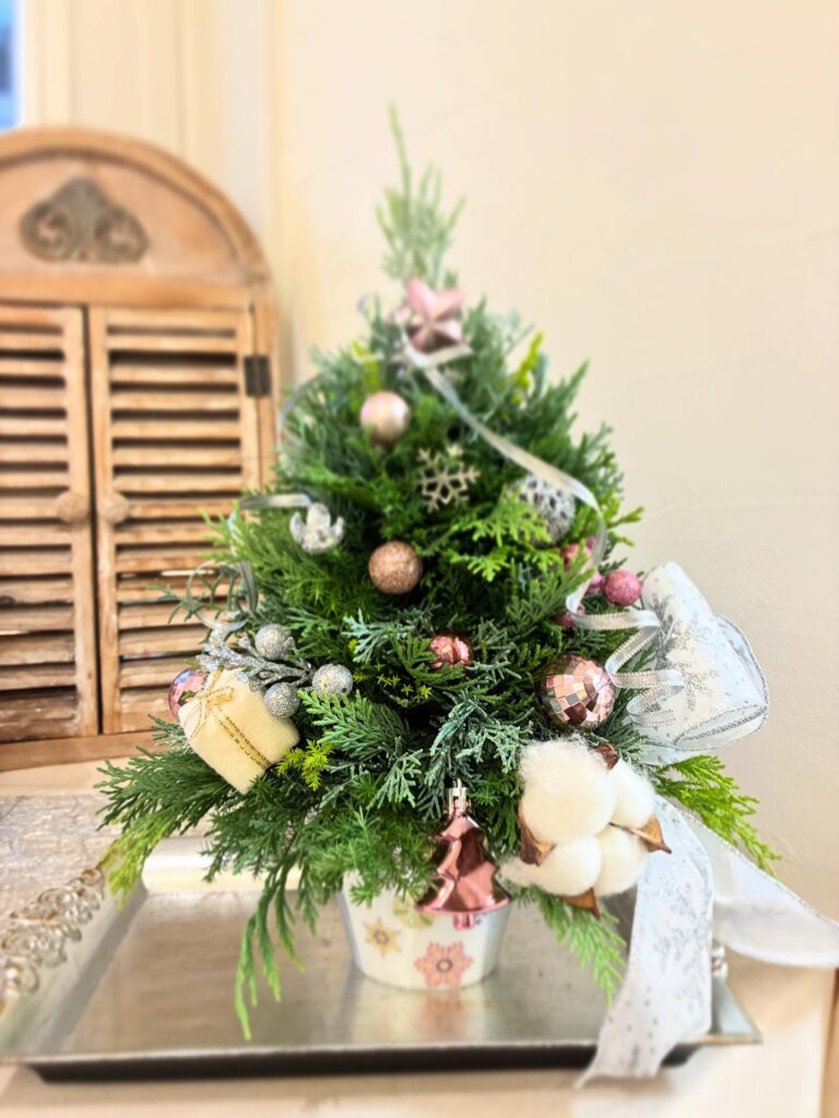 ポーセラーツの鶴田先生がディスプレイに使用するフレッシュグリーンのテーブルツリーを作成されました。