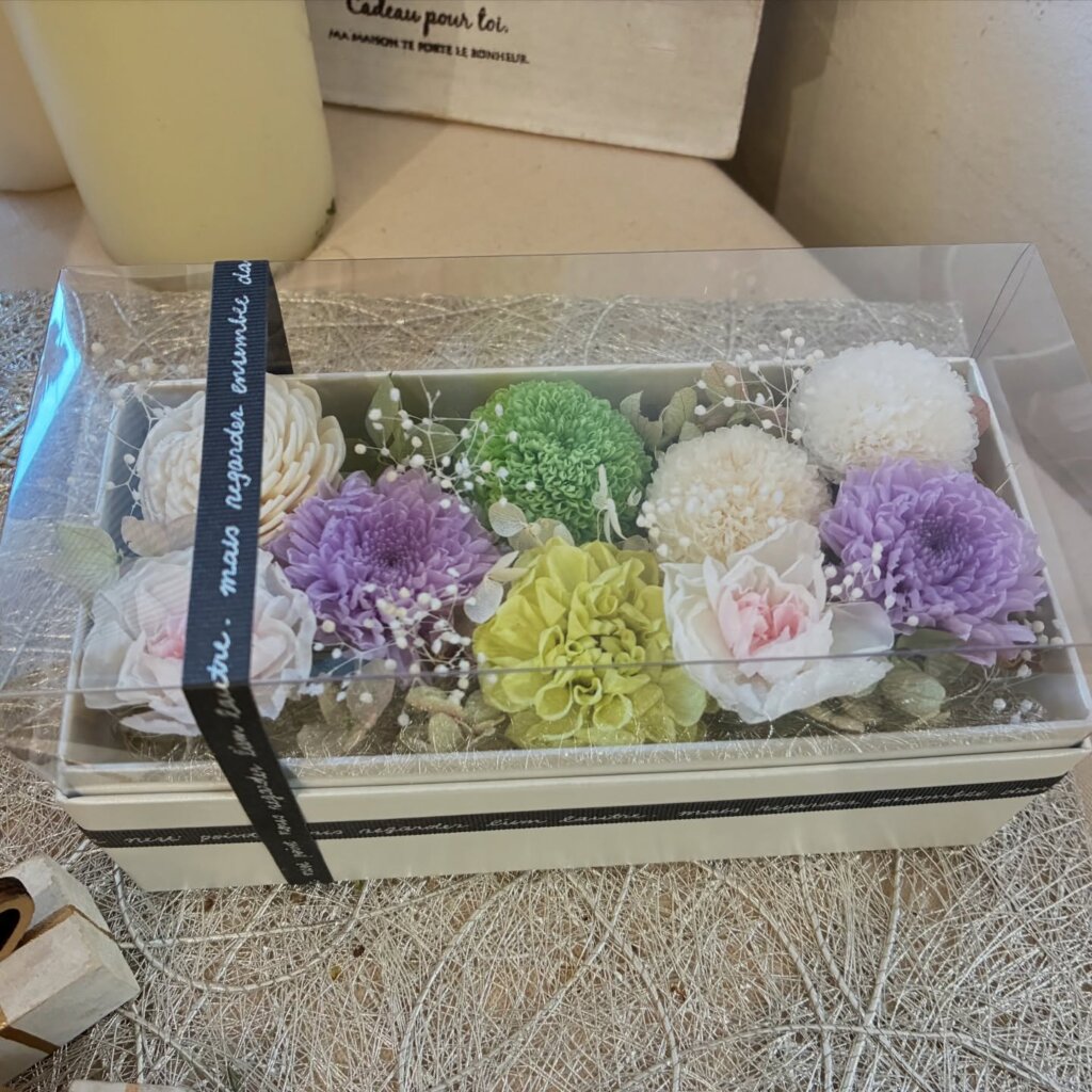 こちらはお悔やみのギフトボックス。プリザーブドフラワーで作成されました