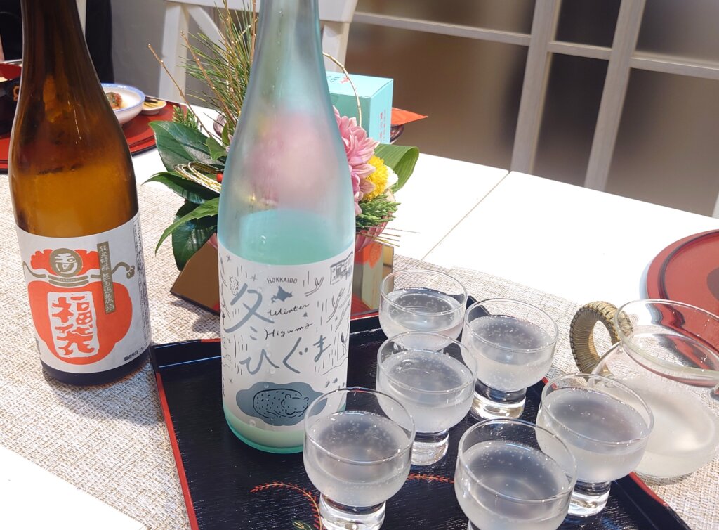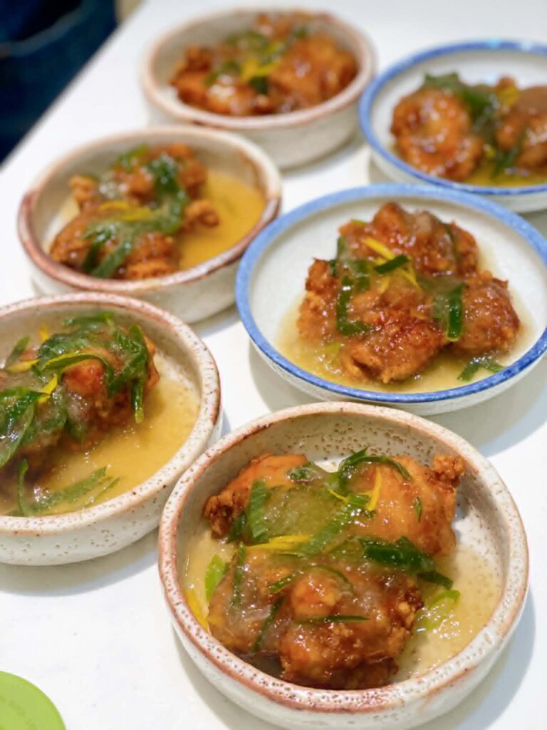 日本酒新酒と ・揚げ鶏のみぞれ餡 ・ 柿なます ・ たまご巾着とちくわ煮