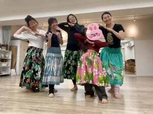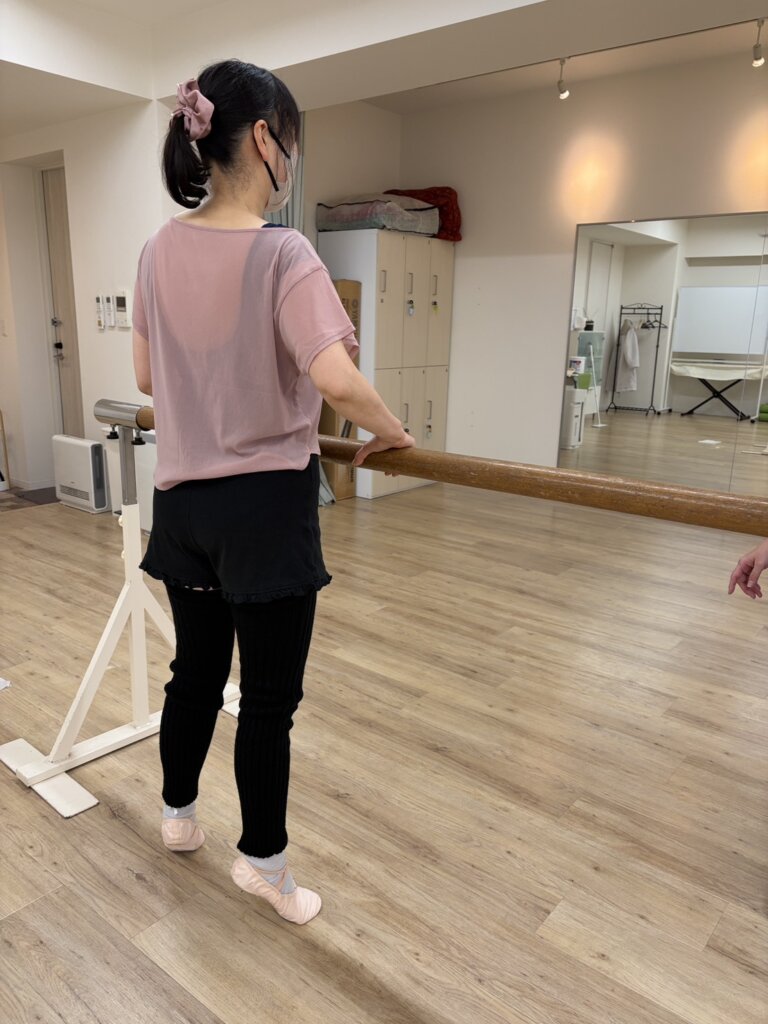 『ルルベ』という背伸びの動きの練習をバーを持って行いました。
