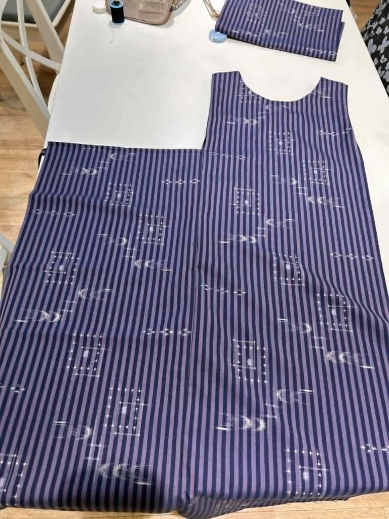 着物の反物を使ってエプロンドレス作りが進んでいます。
