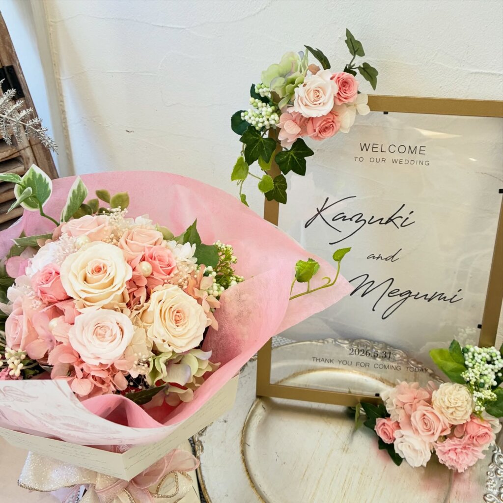 プリザーブドフラワーのブーケとフレーム飾り。