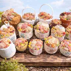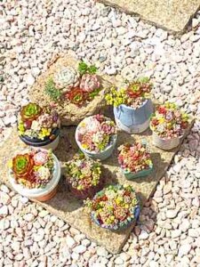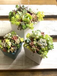多肉植物を花束のように彩りよく寄せ植えしました。育てやすい多肉植物をお庭のアクセントにいかがでしょう。